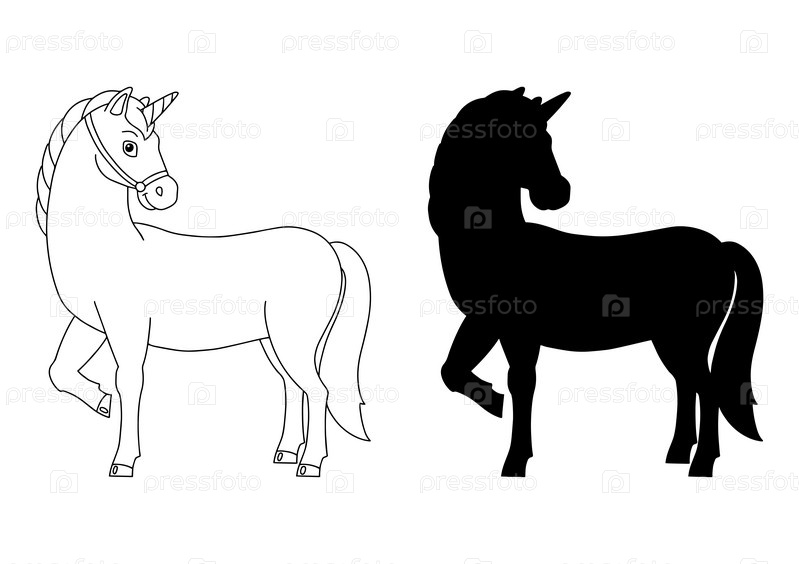 Волшебный фея единорог. Милая лошадь. Черный силуэт. Элемент дизайна. Векторная иллюстрация, изолированная на белом фоне. Шаблон для книг, наклеек, плакатов, открыток, одежды