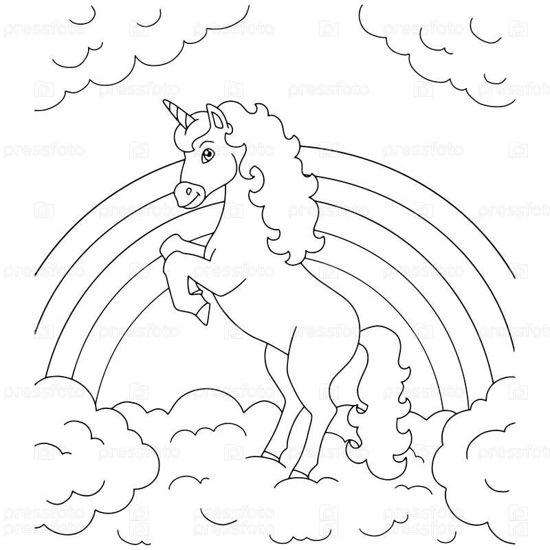 Единорог на облаке. Раскраска для детей. Персонаж в мультяшном стиле. Векторная иллюстрация на белом фоне
