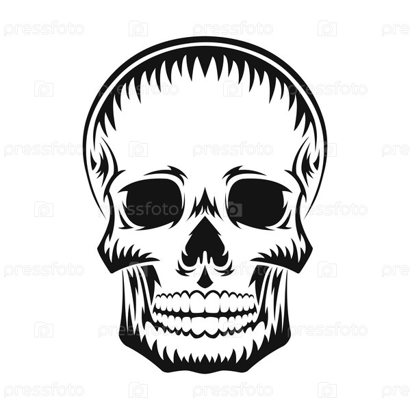 Человеческий череп. Черный силуэт. Элемент дизайна. Нарисованный от руки эскиз. Векторная иллюстрация на белом фоне