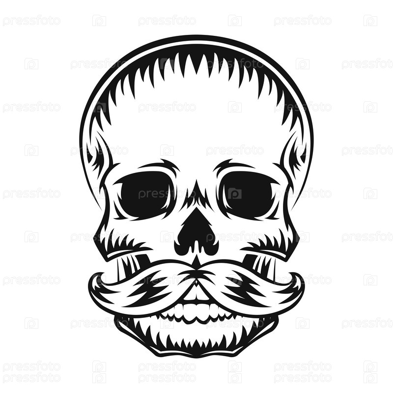 Человеческий череп с усами. Черный силуэт. Элемент дизайна. Нарисованный от руки эскиз. Винтажный стиль. Векторная иллюстрация