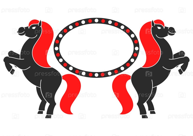 Две лошади встали на дыбы. С местом для вашего текста. Элемент для дизайна этикеток, сайтов. Черный силуэт. Простая плоская векторная иллюстрация