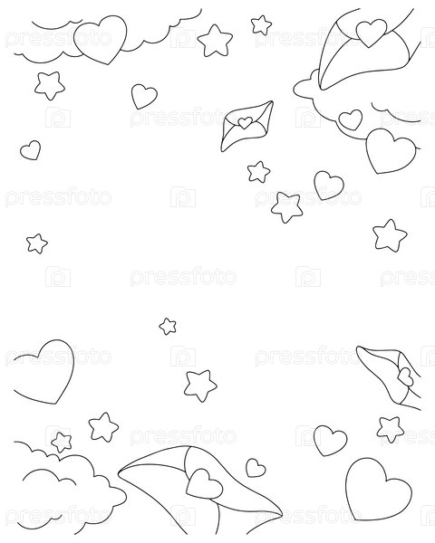Фон с сердечками и облаками. Раскраска для детей. День святого Валентина. Мультяшный стиль. Векторная иллюстрация