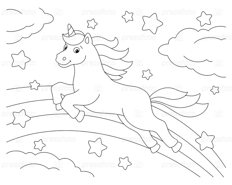Единорог прыгает по радуге. Раскраска для детей. Персонаж в мультяшном стиле. Векторная иллюстрация на белом фоне