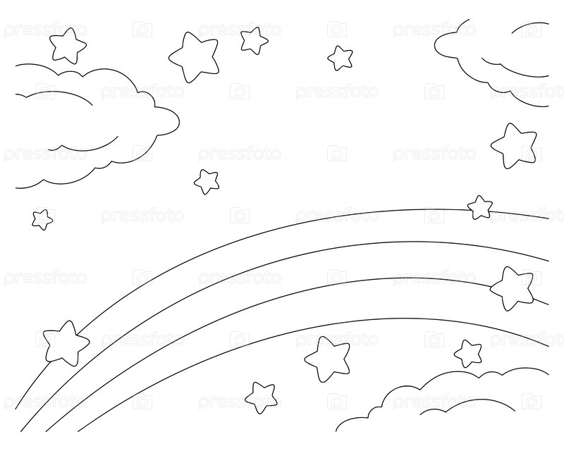 Сцена с радугой, облаком и звездами. Страница раскраски для детей. Персонаж в мультяшном стиле. Векторная иллюстрация на белом фоне