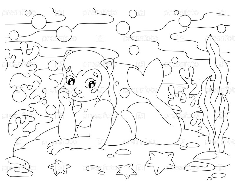 Раскраска для детей. Милая русалочка. Персонаж в мультяшном стиле. Векторная иллюстрация на белом фоне