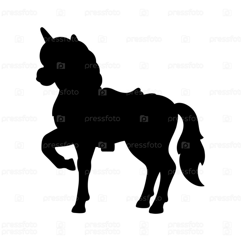 Волшебный единорог. Сказочная лошадь. Черный силуэт. Элемент дизайна. Векторная иллюстрация, изолированная на белом фоне. Шаблон для книг, наклеек, плакатов, открыток, одежды