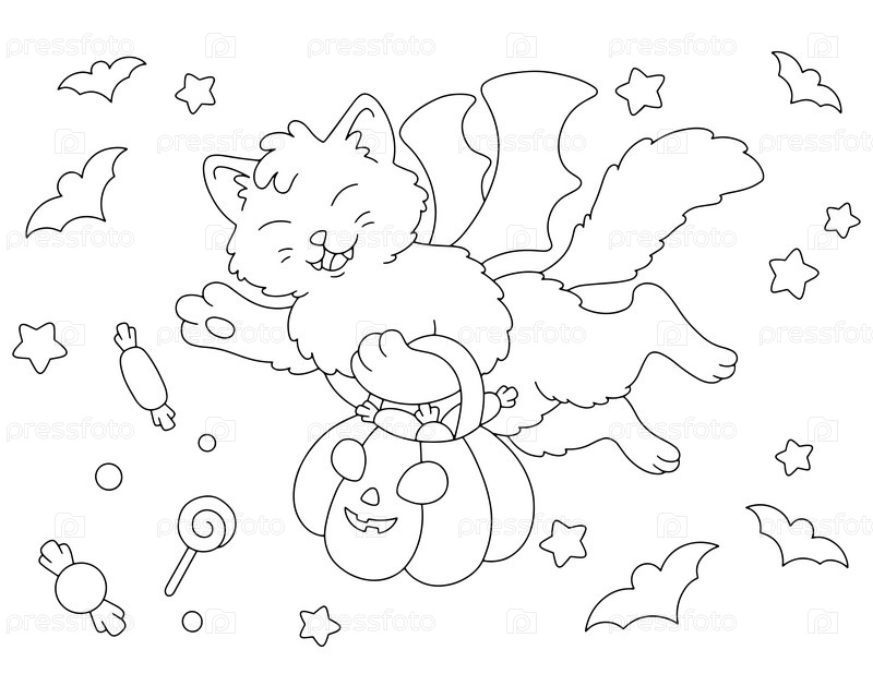 Милый кот несет в лапах тыкву со сладостями. Тема Хэллоуина. Страница раскраски для детей. Персонаж в мультяшном стиле. Векторная иллюстрация на белом фоне