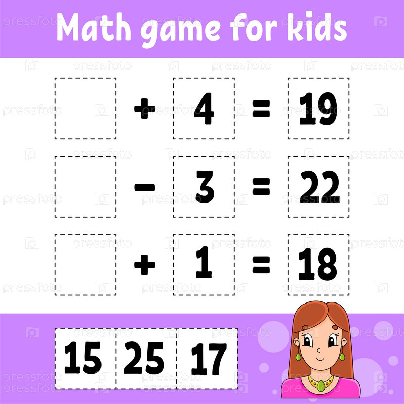 Математическая игра для детей. Образовательный развивающий рабочий лист. Страница с заданиями с картинками. Игра для детей. Цветная изолированная векторная иллюстрация. Забавный персонаж. Мультяшный стиль