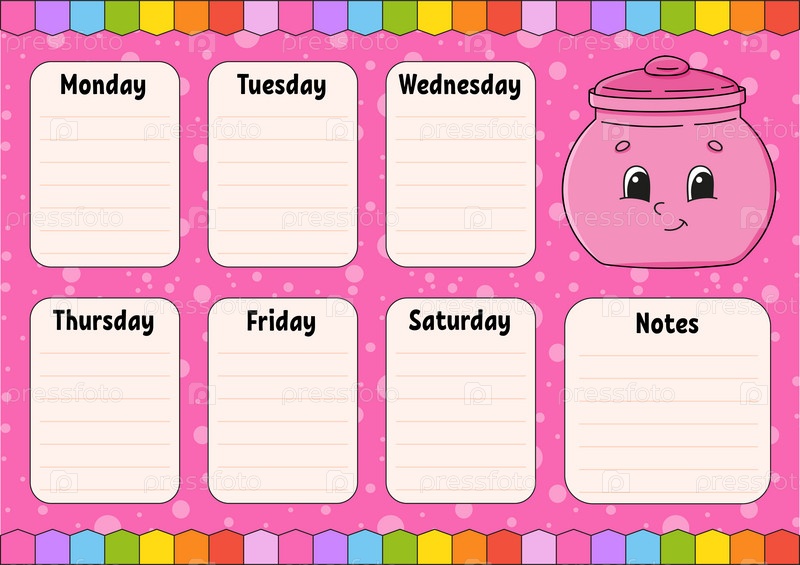 Расписание школы. Расписание для школьников. Пустой шаблон. Еженедельный планировщик с примечаниями. Изолированная цветная векторная иллюстрация. персонаж мультфильма