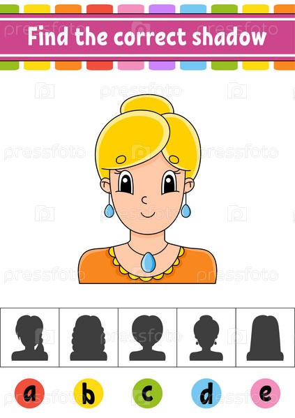 Найдите правильную тень. Рабочий лист по развитию образования. Страница с заданиями. Цветная игра для детей. Изолированная векторная иллюстрация. Персонаж мультфильма