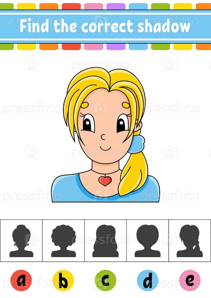 Найдите правильную тень. Рабочий лист по развитию образования. Страница с заданиями. Цветная игра для детей. Изолированная векторная иллюстрация. Персонаж мультфильма