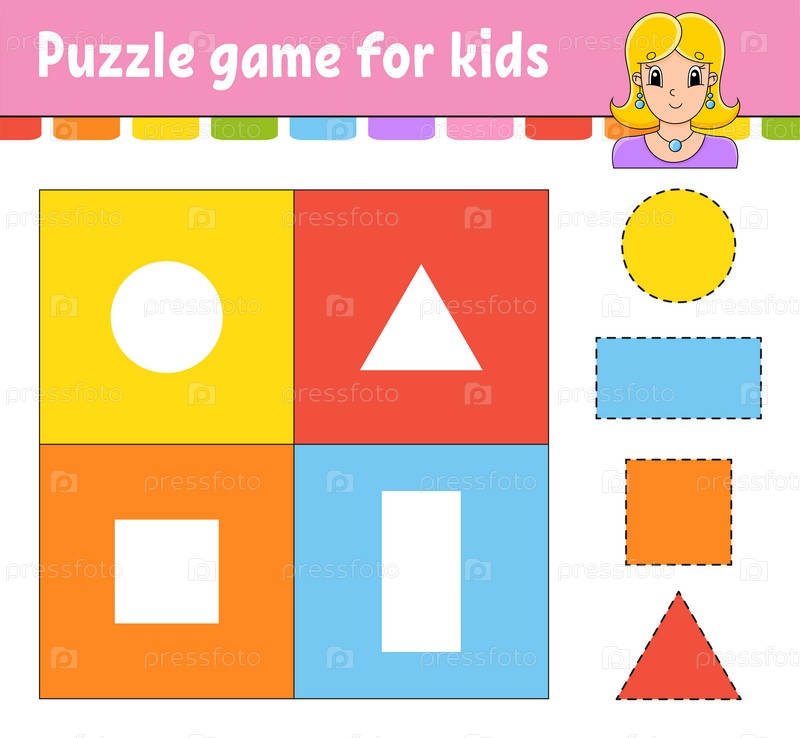 Игра-головоломка для детей. Вырезать и вставить. Практика вырезания. Изучение фигур. Рабочий лист по образованию. Круг, квадрат, прямоугольник, треугольник. Страница с заданиями. Персонаж мультфильма