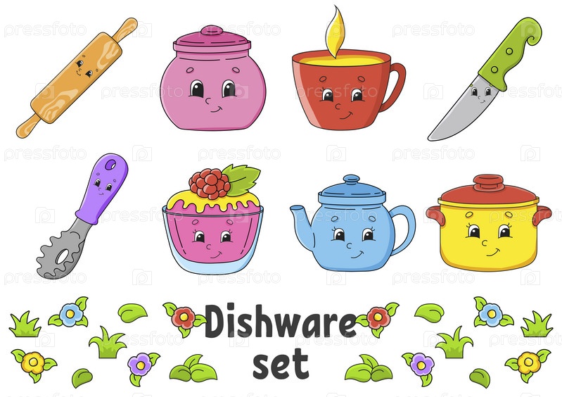 Набор наклеек с милыми персонажами мультфильмов. Нарисовано от руки. Красочная упаковка. Векторная иллюстрация. Тема посуды. Коллекция нашивок для детей. Для ежедневника, органайзера, дневника