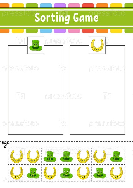 Сортировочная игра для детей. Вырежи и склей. Образовательный развивающий рабочий лист. Игра на соответствие для детей. Страница с цветными заданиями. Головоломка для детей. Милый персонаж. Векторная иллюстрация