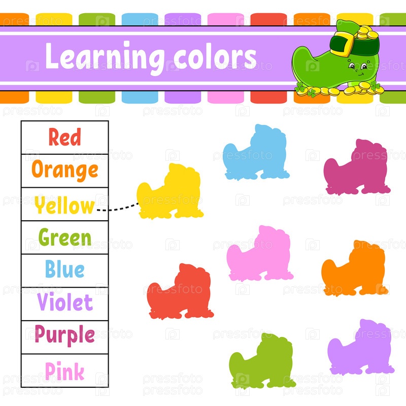 Изучаем цвета. Образовательный развивающий рабочий лист. Страница с заданиями с картинками. Игра для детей. Забавный персонаж. Мультяшный стиль. Векторная иллюстрация