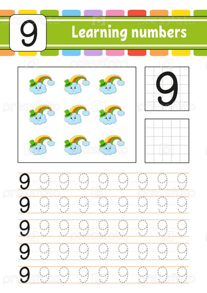 Обводка и написание цифр. Практика письма. Изучение цифр для детей. Образовательный развивающий рабочий лист. День Святого Патрика. Страница с заданиями. Изолированная векторная иллюстрация в милом мультяшном стиле