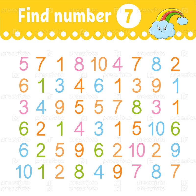Найдите число. Образовательный развивающий рабочий лист. Страница с заданиями с картинками. Игра для детей. Цветная изолированная векторная иллюстрация. Забавный персонаж. Мультяшный стиль