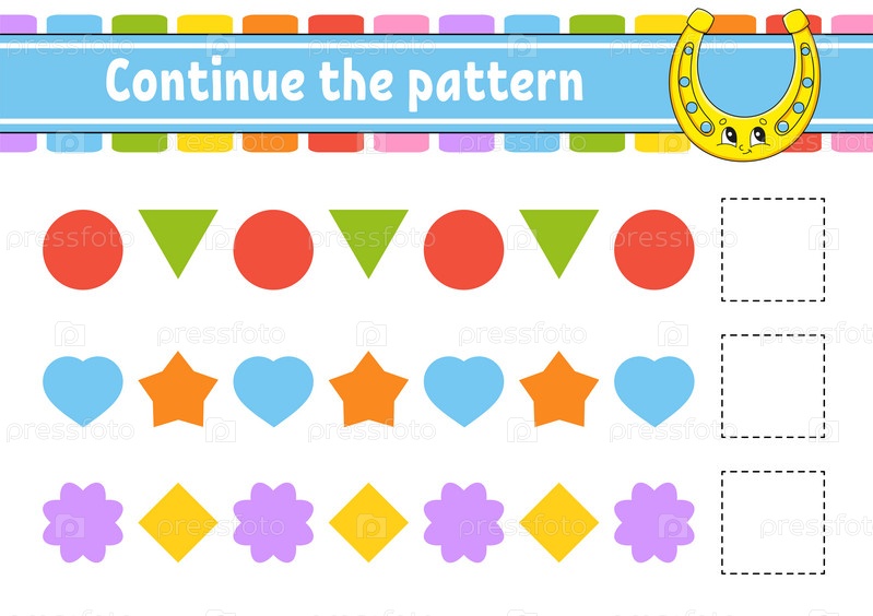 Продолжить узор. Рабочий лист по развитию образования. Игра для детей. Страница с заданиями. Головоломка для детей. Загадка для дошкольников. Плоская изолированная векторная иллюстрация. Милый мультяшный стиль