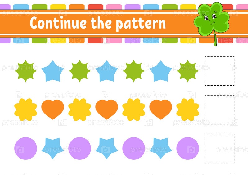 Продолжить узор. Рабочий лист по развитию образования. Игра для детей. Страница с заданиями. Головоломка для детей. Загадка для дошкольников. Плоская изолированная векторная иллюстрация. Милый мультяшный стиль