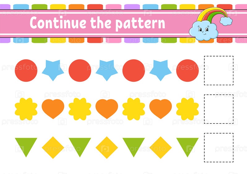 Продолжить узор. Рабочий лист по развитию образования. Игра для детей. Страница с заданиями. Головоломка для детей. Загадка для дошкольников. Плоская изолированная векторная иллюстрация. Милый мультяшный стиль