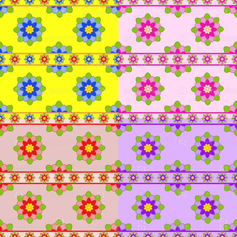 Набор бесшовных узоров из красных, синих, розовых, фиолетовых цветов с узкими цветочными лентами на цветном фоне