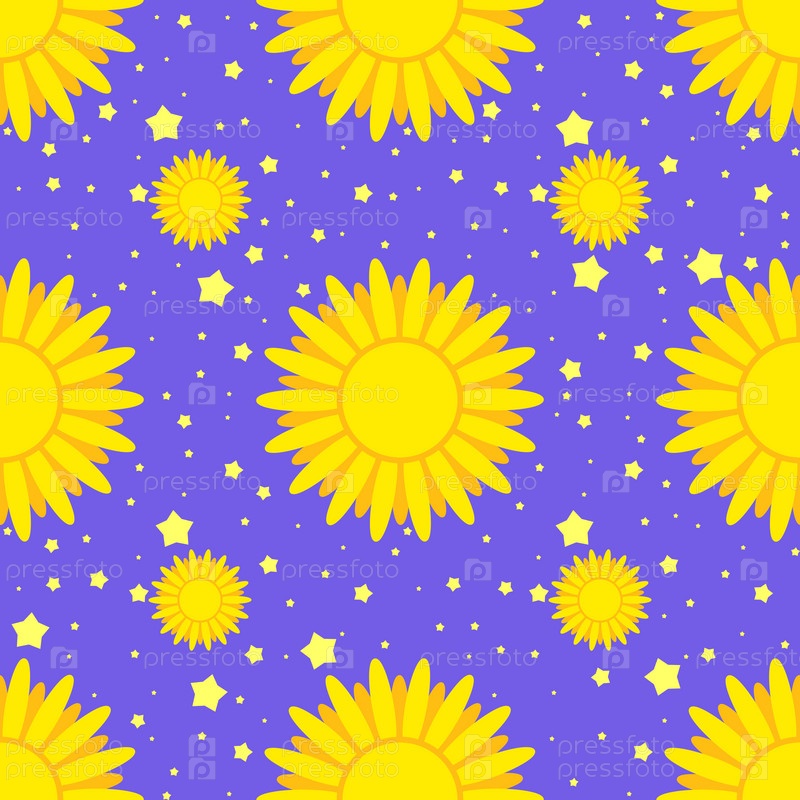 Бесшовный узор из желтых солнц на фоне звезд и голубого неба