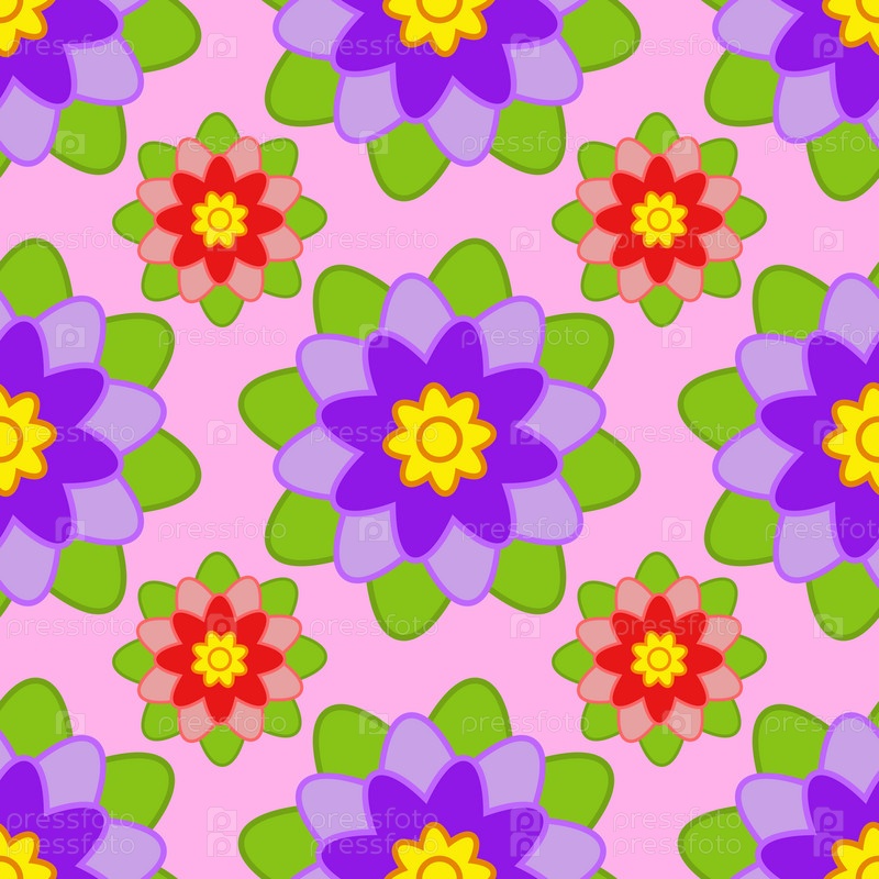 Бесшовный узор из фиолетовых и красных цветов с зелеными листьями на розовом фоне