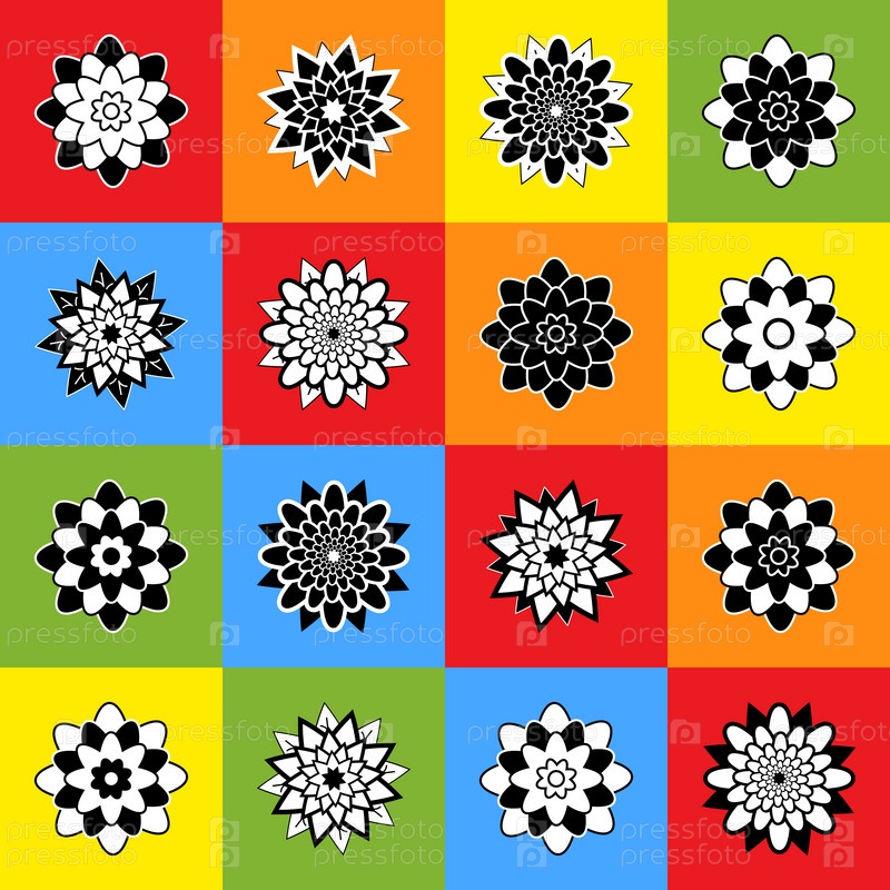 Набор из шестнадцати абстрактных черно-белых цветов на цветных квадратах