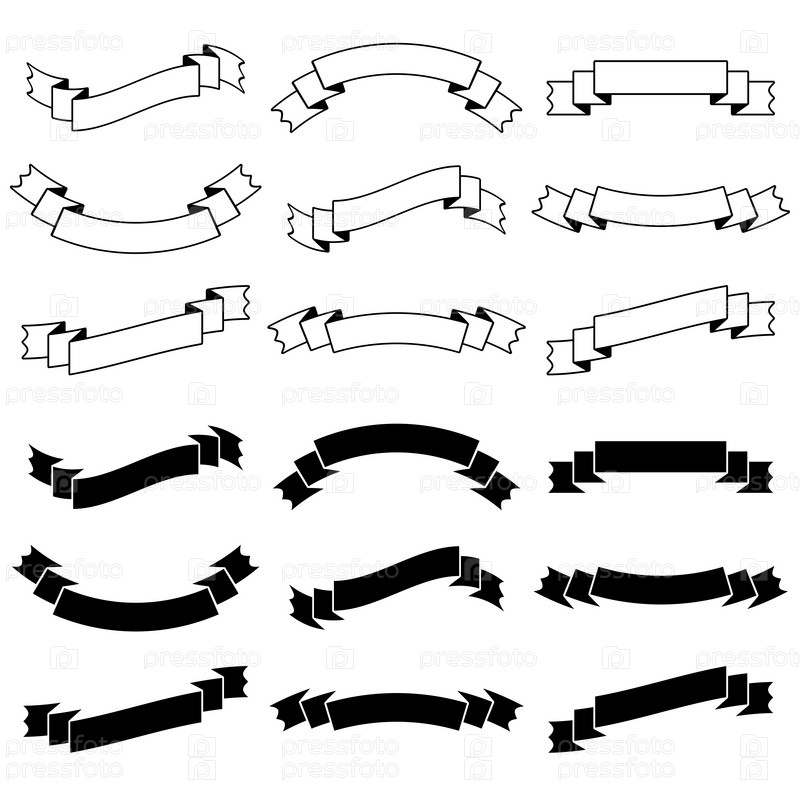 Набор плоских белых и черных изолированных силуэтов баннеров с лентами на белом фоне