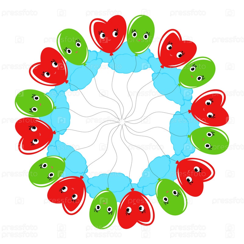 Круглый венок из улыбающихся шаров мультяшного зеленого и красного цвета. На белом фоне