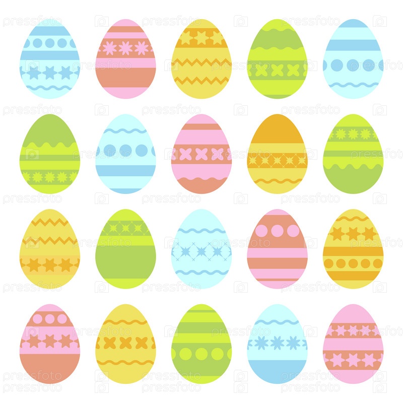 Набор цветных изолированных пасхальных яиц на белом фоне. С абстрактным узором. Простая плоская векторная иллюстрация. Подходит для оформления открыток, рекламы, журналов, веб-сайтов