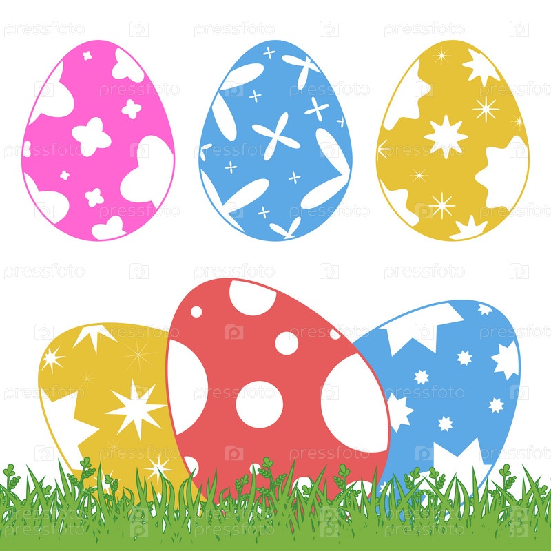 Набор цветных изолированных пасхальных яиц на зеленой траве на белом фоне. С абстрактным узором. Простая плоская векторная иллюстрация. Подходит для оформления открыток, рекламы, журналов, веб-сайтов