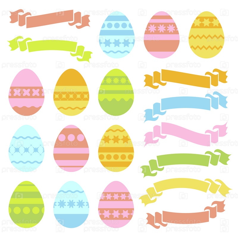 Набор цветных изолированных пасхальных яиц и ленточных баннеров на белом фоне. С абстрактным геометрическим узором. Простая плоская векторная иллюстрация. Подходит для оформления открыток, рекламы, журналов, веб-сайтов