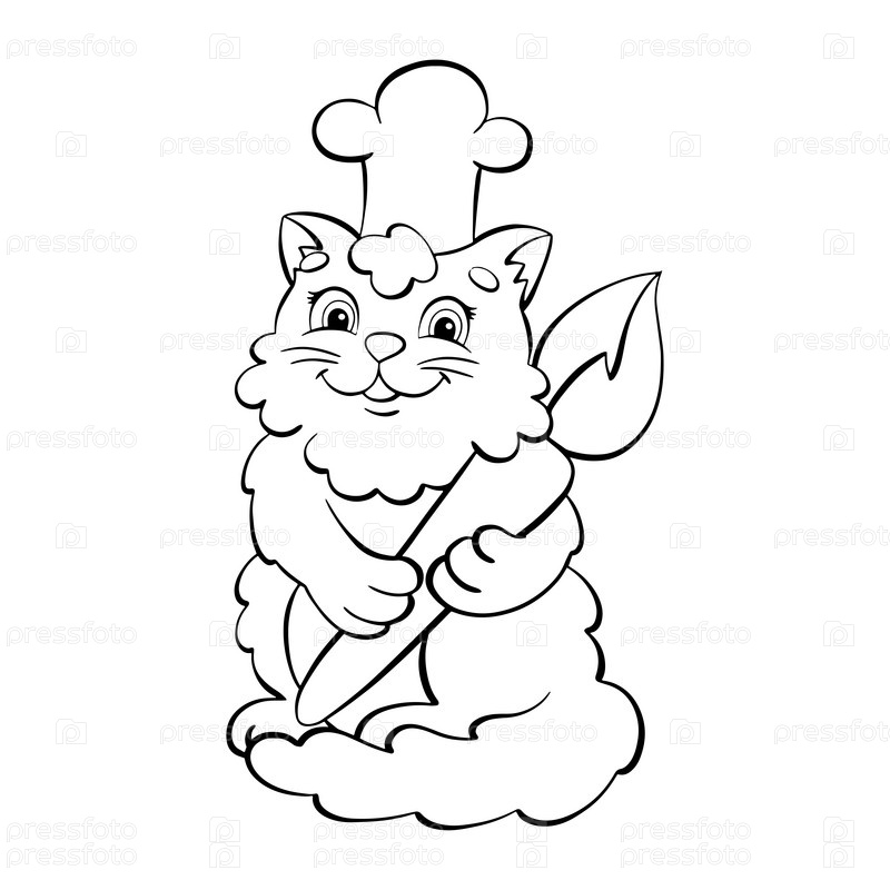 Пушистый кот-художник-повар с кисточкой в лапах. Раскраска для детей. Цифровой штамп. Персонаж в мультяшном стиле. Векторная иллюстрация на белом фоне