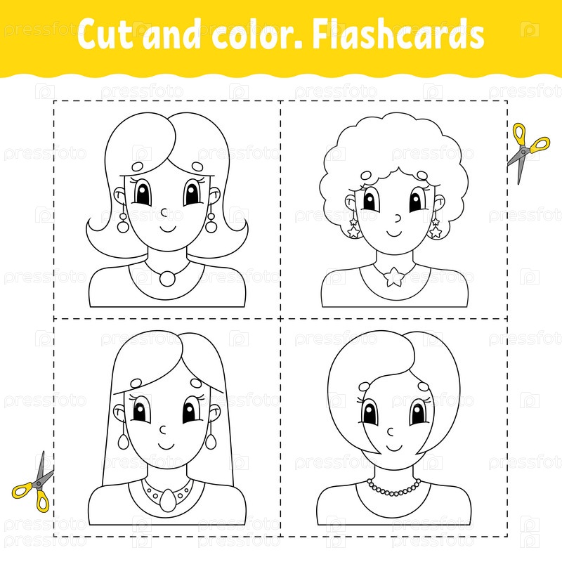 Вырезать и раскрасить. Набор карточек. Раскраска для детей. Милый персонаж мультфильма. Черный контурный силуэт. Изолирован на белом фоне. Векторная иллюстрация