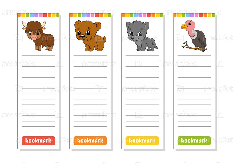 Набор бумажных закладок для книг с милыми мультяшными персонажами. Для детей. Изолированные на белом фоне. Векторная иллюстрация
