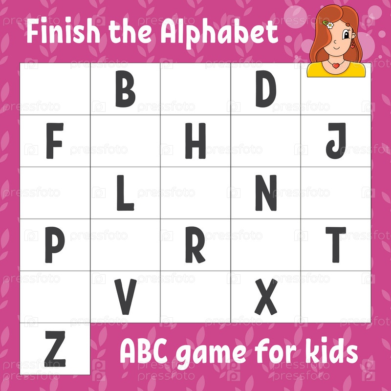 Завершите алфавит. Игра ABC для детей. Образовательный рабочий лист развития. Учебная игра для детей. Цветовая страница с заданиями. Векторная иллюстрация