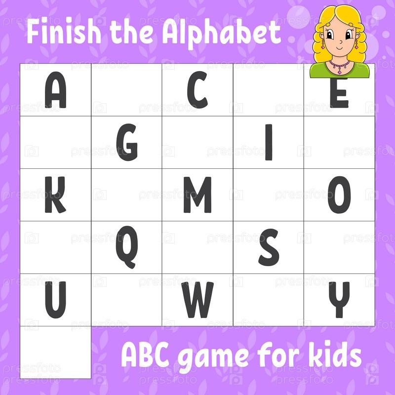 Завершите алфавит. Игра ABC для детей. Образовательный рабочий лист развития. Учебная игра для детей. Цветовая страница с заданиями. Векторная иллюстрация