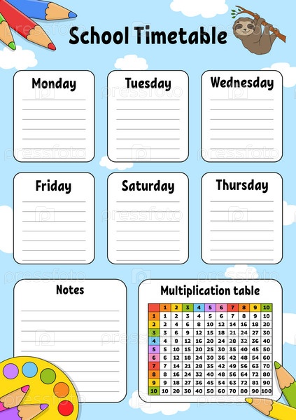 Расписание школы с таблицей умножения. Для образования детей. Изолировано на белом фоне. С милым персонажем мультфильма. Векторная иллюстрация