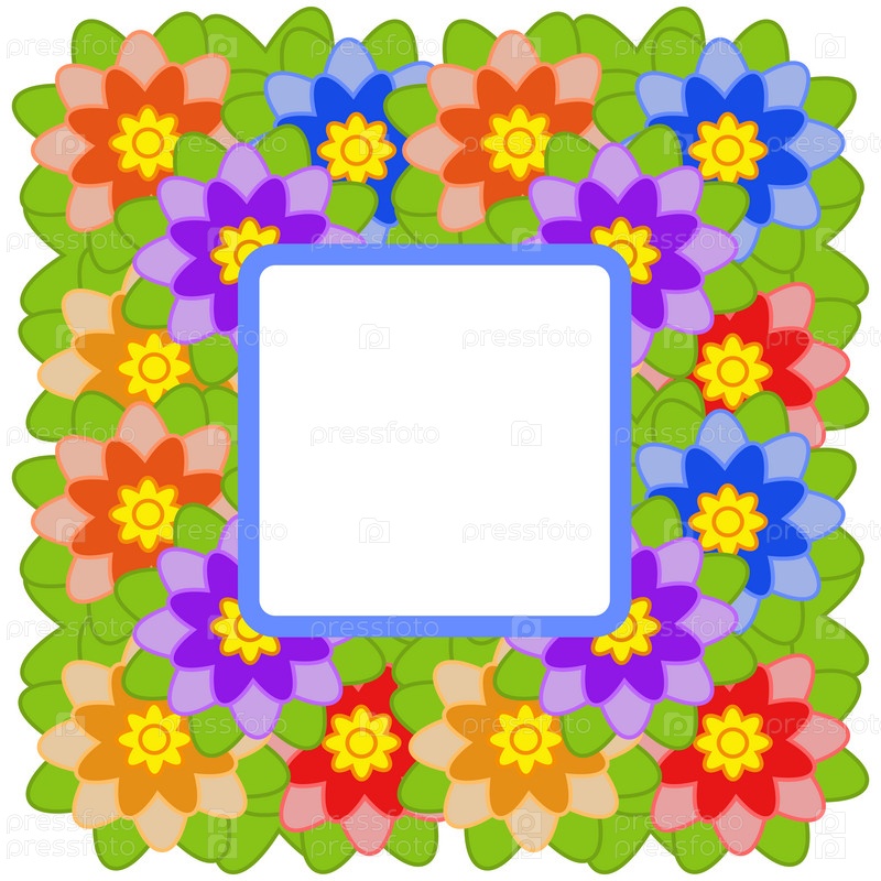 Квадратная рамка из оранжевых, фиолетовых, синих цветов с зелеными листьями на белом фоне
