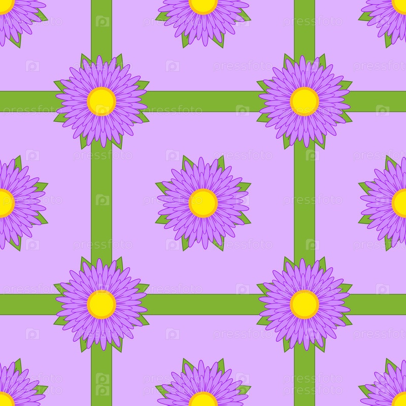 Бесшовный узор из фиолетовых цветов с лентами и листьями на фиолетовом фоне