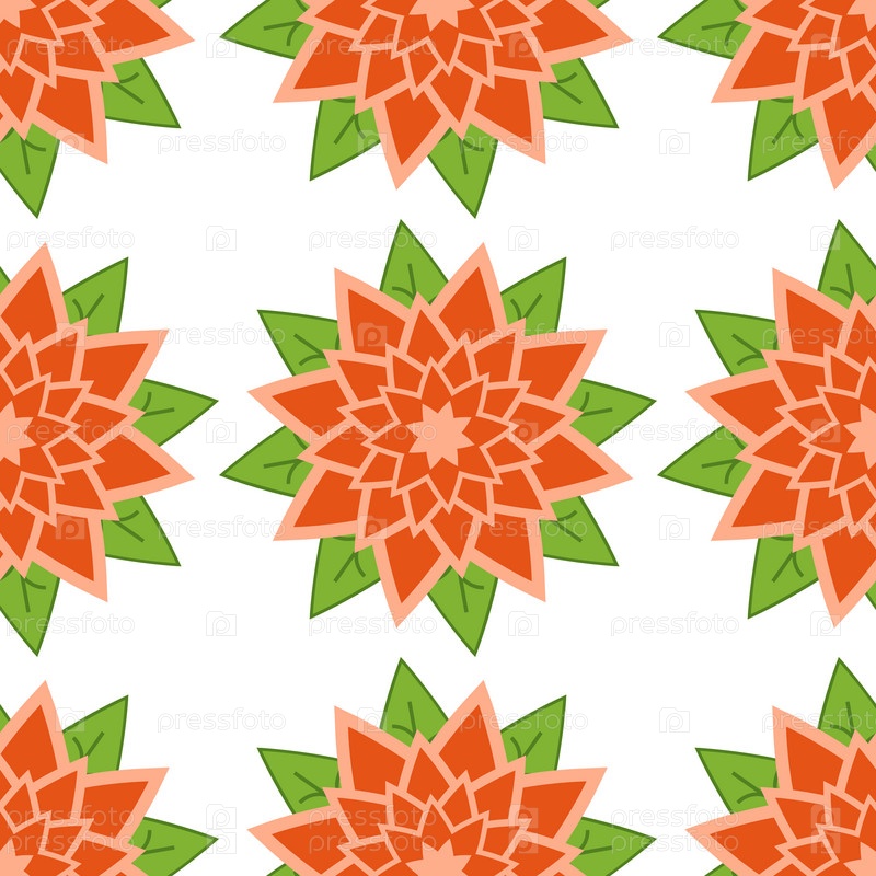 Бесшовный узор из красно-оранжевых цветов с зелеными листьями на белом фоне