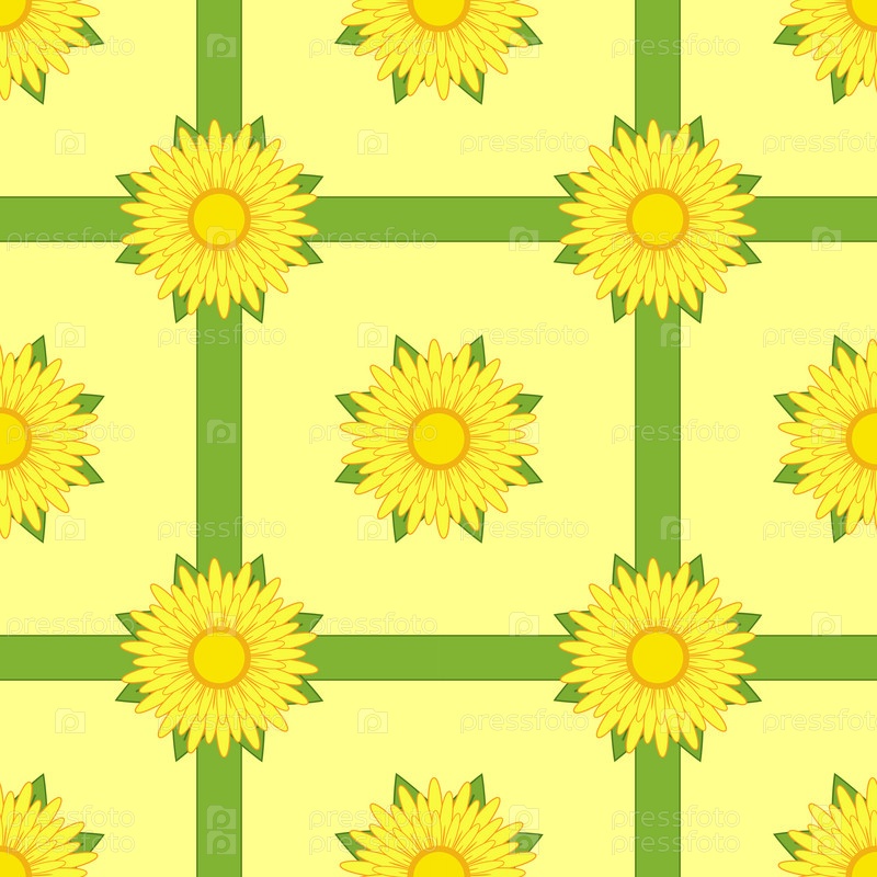 Бесшовный узор из желтых цветов с лентами и листьями на светло-желтом фоне