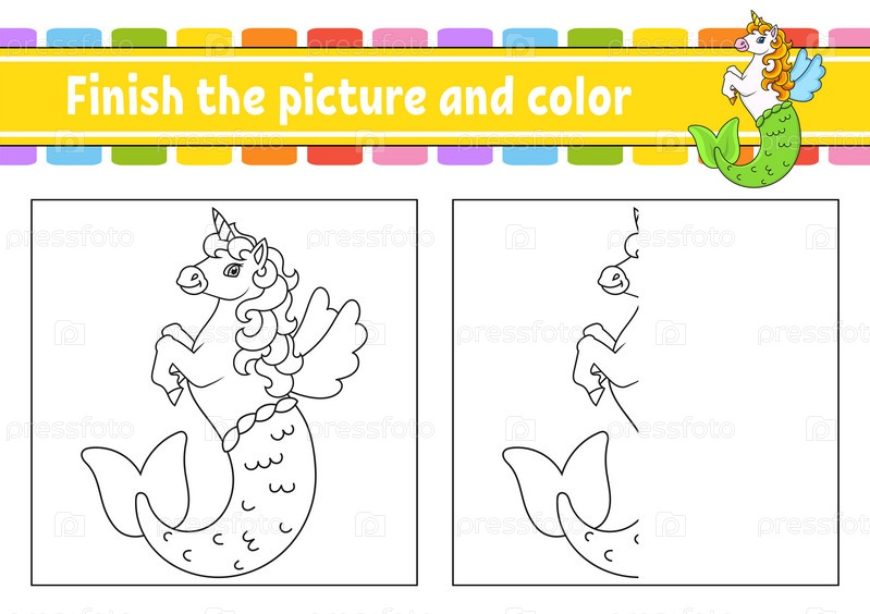 Закончите рисунок и раскрасьте. Персонаж мультфильма, изолированный на белом фоне. Для образования детей. Рабочий лист с заданиями