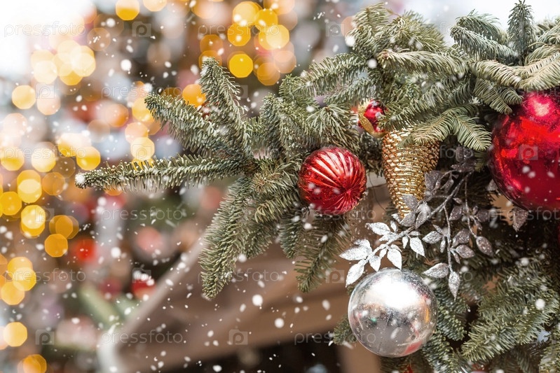 Красивые праздничные украшения на елке. Крупный план. Красивый рождественский фон. Концепция украшений и декора на новый год. Новогодняя открытка 2025