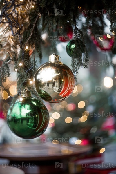Красивые праздничные украшения на елке. Крупный план. Красивый рождественский фон. Концепция украшений и декора на новый год. Новогодняя открытка 2025