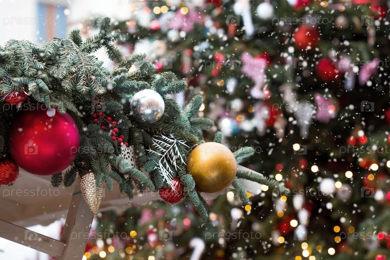 Красивые праздничные украшения на елке. Крупный план. Красивый рождественский фон. Концепция украшений и декора на новый год. Новогодняя открытка 2025