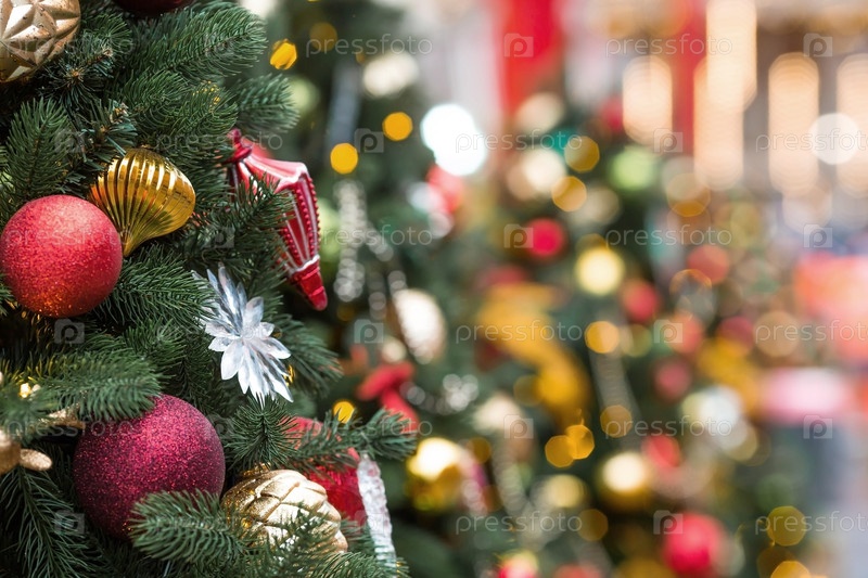 Красивые праздничные украшения на елке. Крупный план. Красивый рождественский фон. Концепция украшений и декора на новый год. Новогодняя открытка 2025
