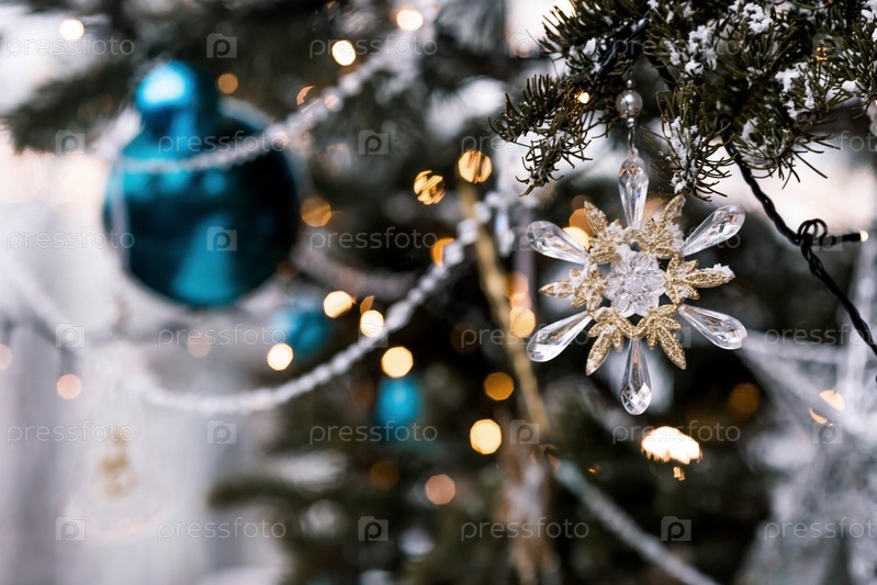 Красивое праздничное украшение снежинки на елку. Крупный план. Красивый рождественский фон. Концепция украшений и декора на новый год. Новогодняя открытка 2025