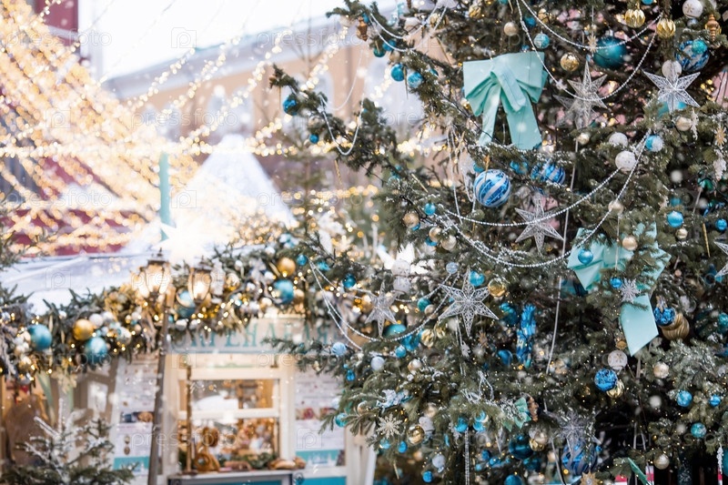 Красивые праздничные украшения на елке. Крупный план. Красивый рождественский фон. Концепция украшений и декора на новый год. Новогодняя открытка 2025